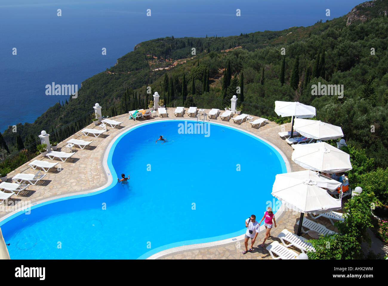 View From Golden Fox Restaurant Of Outdoor Swimming Pool Lakones Kerkyra Corfu Ionian Islands Greece Stock Photo Alamy